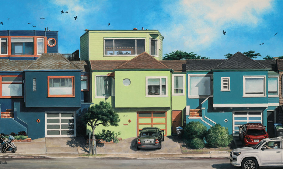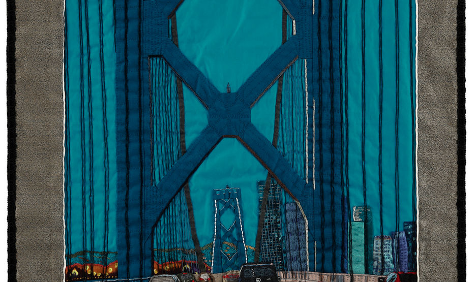 Working from personal photographs of favorite places in San Francisco they each create a piece in their respective mediums. The work is presented side-by-side giving the viewer two different interpretations of the same image. Lynette’s precisely painted scenes, in her signature realist style, eloquently capture light and shadow. While Charlotte meticulously stitches the same scene using fabric and thread, the hand ever-present as lines ungulate and waver into focus.
